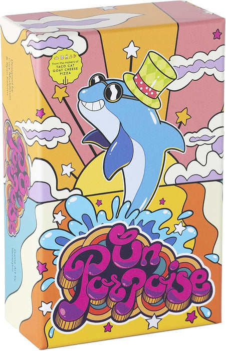 The best dressed dolphin takes the ocean in this fast paced card game! You will be challenged by polka dots, paisley patterns and predators as you race to get rid of your cards first. Keep a look out because there are more than just sharks in this water. Catch the cards played On Porpoise and you just might live to tell the tale!